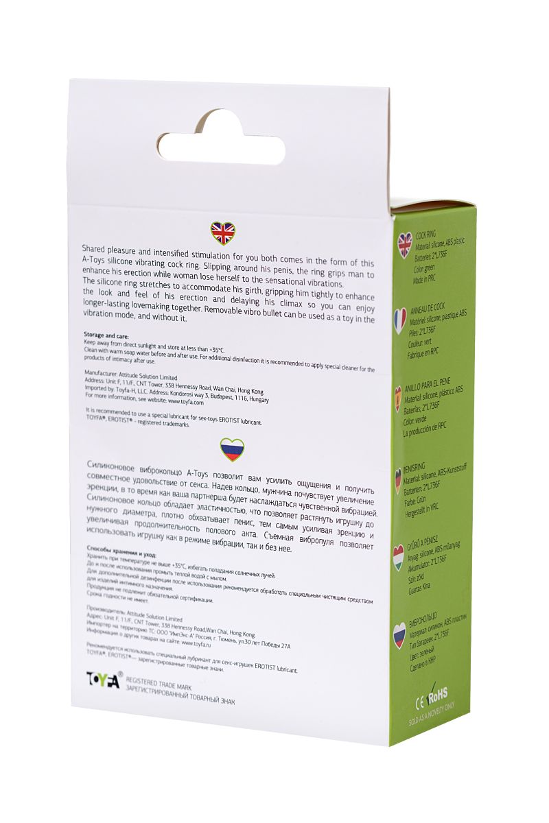 Силиконовое виброкольцо A-toys by TOYFA позволит вам усилить ощущения и получить совместное удовольствие от секса. Надев кольцо, мужчина почувствует увеличение эрекции, в то время как ваша партнерша будет наслаждаться чувственной вибрацией. Силиконовое кольцо обладает эластичностью, что позволяет растянуть игрушку до нужного диаметра, плотно обхватывает пенис, тем самым усиливая эрекцию и увеличивая продолжительность полового акта. Съемная вибропуля позволяет использовать игрушку как в режиме вибрации, так и без нее.