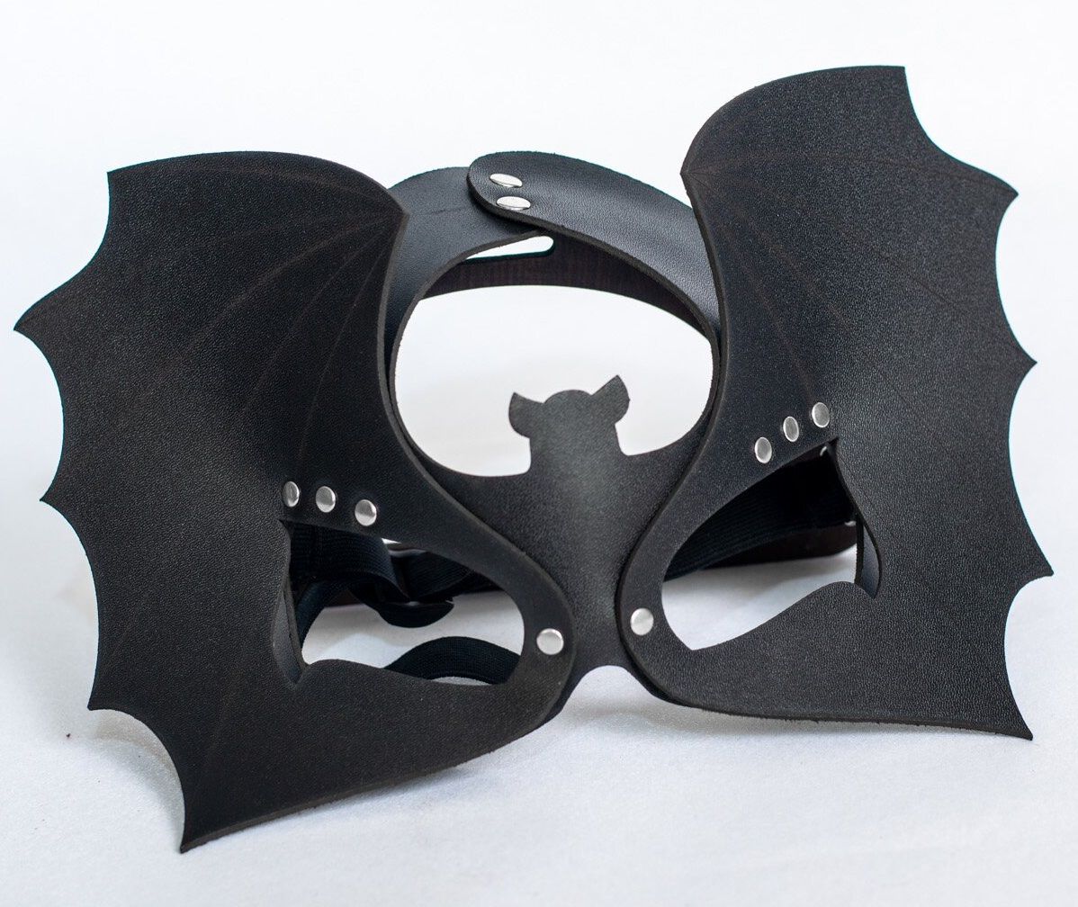 Черная кожаная маска на глаза. Выполнена в форме летучей мыши.