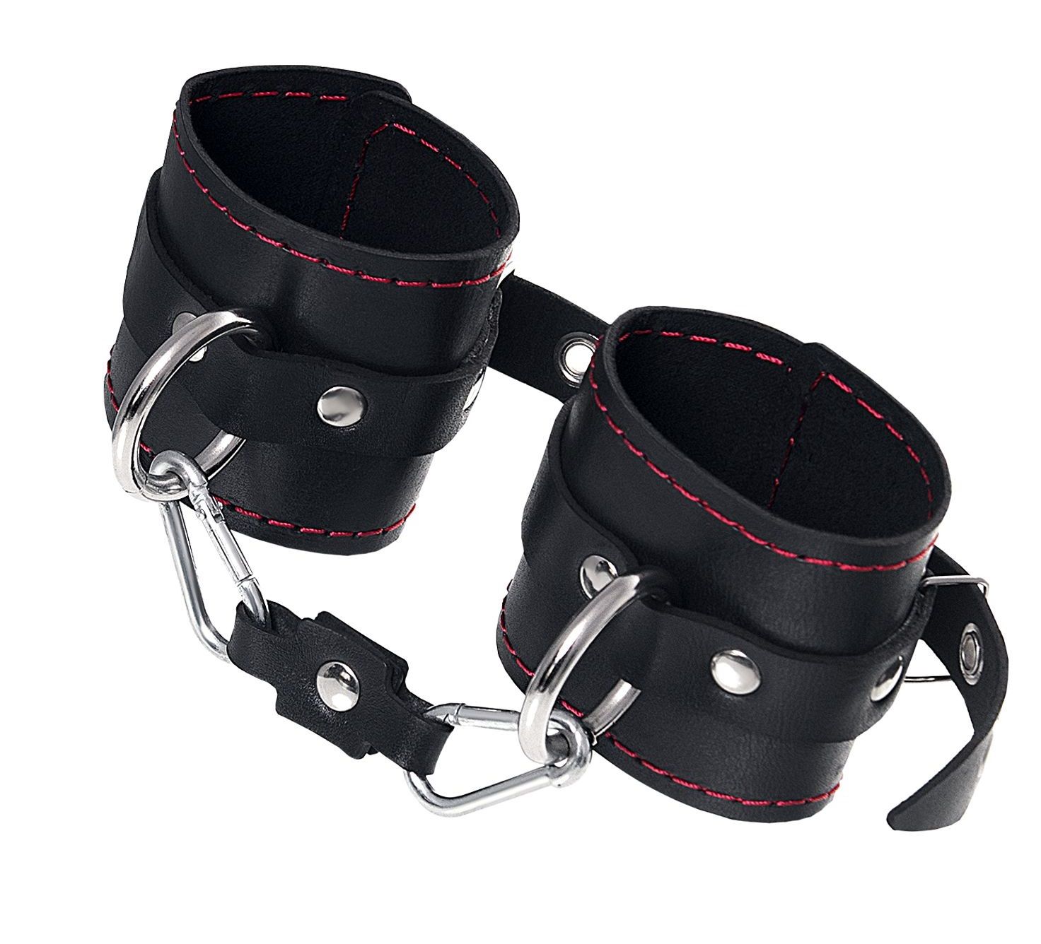 Однослойные кожаные наручники с контрастной строчкой красного цвета могут стать стильным аксессуаром на «свободных» руках, но могут послужить вашим целям и фантазиям по своему прямому назначению. Наличие двух карабинов и колец позволяет использовать изделие как раздельно – аксессуар-манжеты, так и как наручники для фиксации. К широким металлическим кольцам также можно присоединить и другие аксессуары при помощи карабинов. Благодаря универсальному размеру наручники могут использоваться и мужчинами, и женщинами. Размер легко регулируется с помощью металлических пряжек, органично вписывающихся в общий стиль. Длина манжет - 20 см, ширина - 6,5 см. Длина сцепки - 11 см.