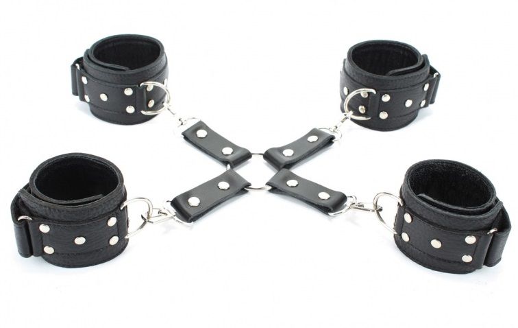 Комплект фиксаторов для рук и ног – это возможность провести жаркую ночку, играя в покорную рабу и господина. БДСМ-атрибутика состоит из кожаных поножей и наручников, соединенных между собой карабинами и цепями. Их размер легко откорректировать липучкой. Этот набор БДСМ позволит сковать руки и ноги за спиной и отдать попку/вагину на страстное растерзание. Ширина наручей и поножей – 5 см.