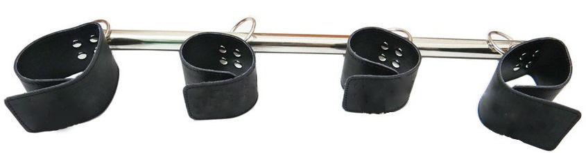 Металлическая штанга серебристго цвета. По всей длине на одинаковом расстоянии друг от друга расположены крепления для рук и ног в виде оков. Оковы изготовлены из кожи, украшены заклепками. Размер регулируется при помощи застежек-липучек. Оковы крепятся к штанге при помощи карабинов. Ширина оков - 5 см.