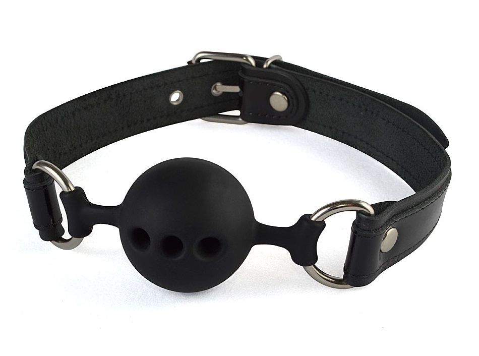 Силиконовый кляп-шар с ремешками из натуральной кожи черного цвета. Вдоль ремешков проходит лаковая кожаная накладка черного цвета. Регулируется девайс при помощи металлической пряжки. Металлическая фурнитура имеет никелевое покрытие.